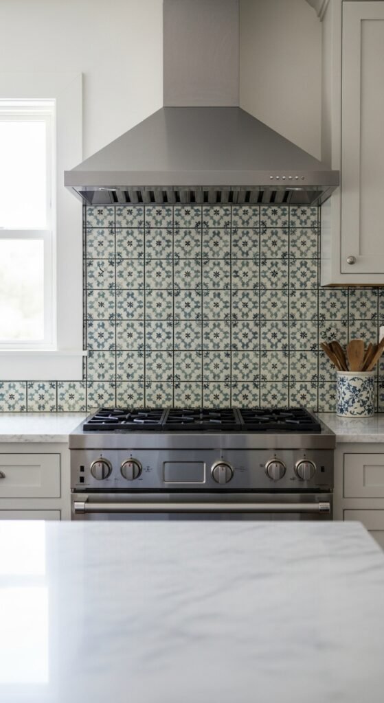 A subtle tile pattern behind the stove adds color and personality without overwhelming the room.