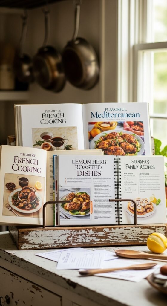 Arrange your favorite cookbooks on a rustic stand or shelf so recipes are always handy.