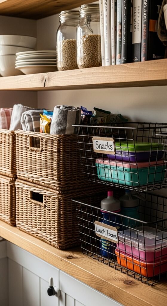 Use wicker or wire baskets under shelves to hold dish towels, snacks, or kids’ lunch items.