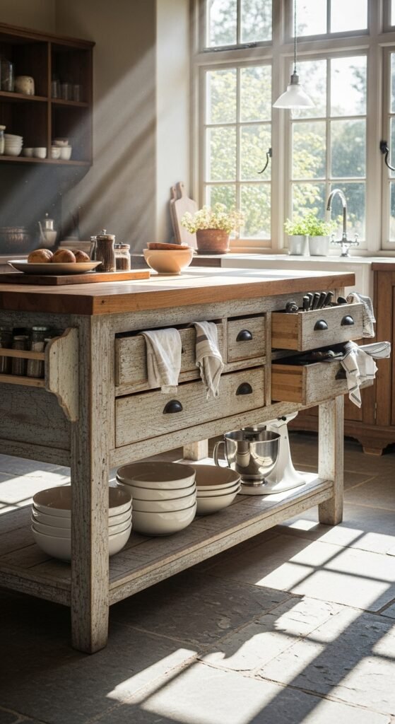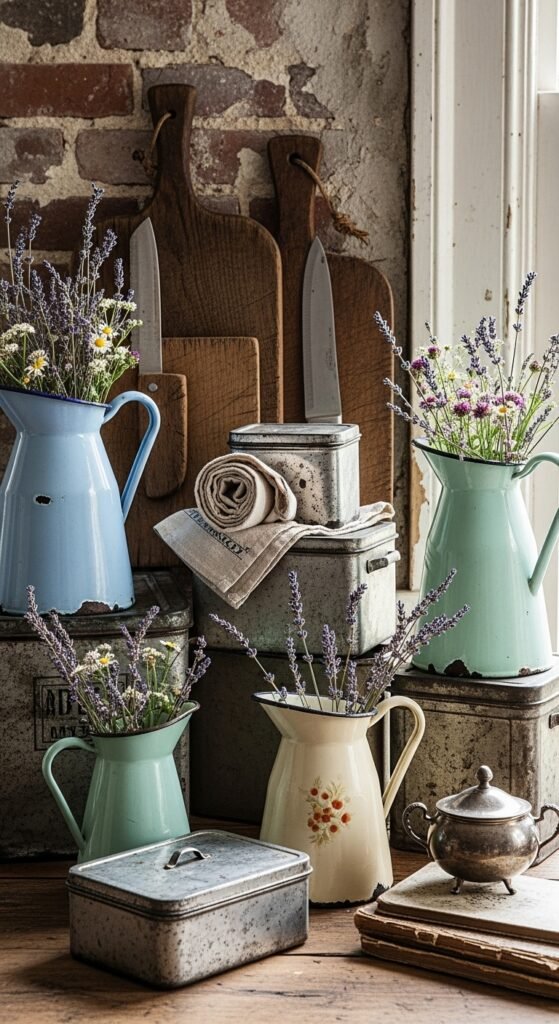 Decorate with enamel jugs, bread tins, or weathered cutting boards for personality.
