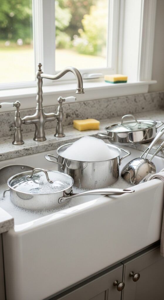 A deep farmhouse sink handles big pots and pans with ease, adding style and practicality.