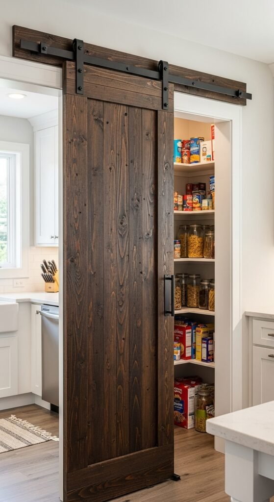 Barn doors save space and provide quick access to dry goods or cleaning supplies.