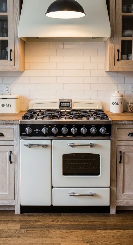 Upgrade your stove to a cream, black, or sage-green range with retro knobs to anchor the design.
