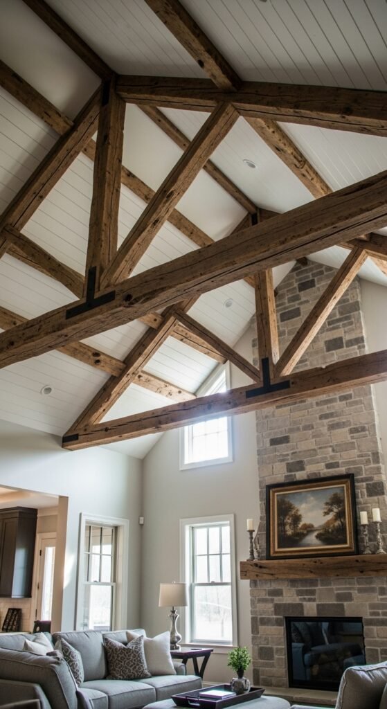 Reclaimed beams draw the eye upward, giving plain ceilings warmth and architectural interest.