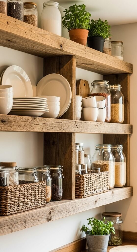 Open shelves make it easy to grab plates, mugs, and ingredients. Use sturdy reclaimed wood for an authentic farmhouse vibe.