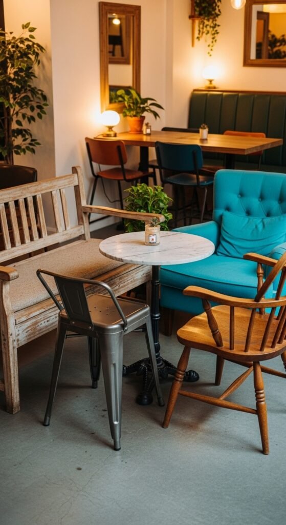 Blend stools, benches, and chairs in different finishes for a relaxed, budget-friendly setup.