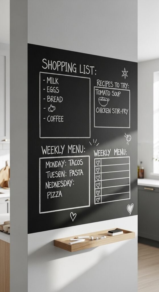 Paint part of a wall with chalkboard paint for shopping lists, recipes, or weekly menus.