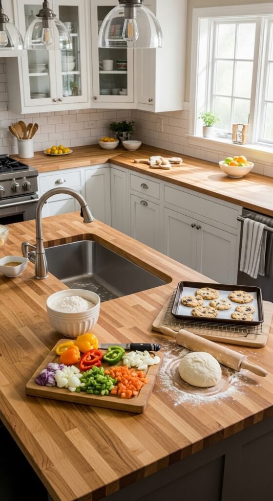 Durable and warm, butcher block countertops provide a perfect surface for meal prep, baking, or serving.