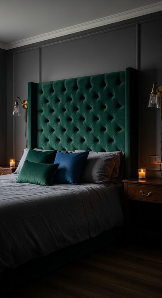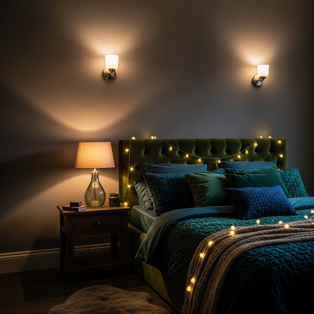 Lighting makes all the difference in a moody bedroom. Skip harsh ceiling lights and opt for dimmable sconces, warm-toned lamps, and string lights. The layered glow enhances romance while highlighting the richness of your bedroom design.