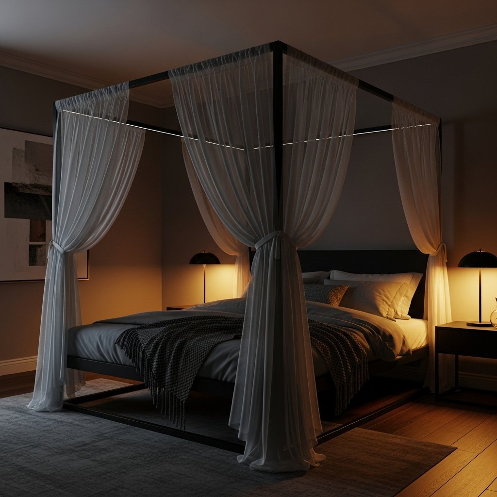 Few things feel as romantic as a canopy bed draped with sheer fabric. For a modern twist, opt for a sleek black metal or dark wood frame. It creates intimacy and frames your bed beautifully as the centerpiece of the room.