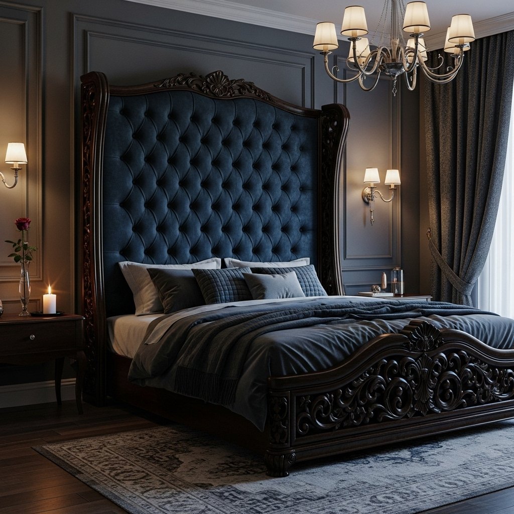 A bold headboard acts as the focal point in a romantic moody bedroom. Choose from tufted velvet, dark leather, or ornate wood. The drama instantly elevates your space while setting a luxurious, passionate tone.