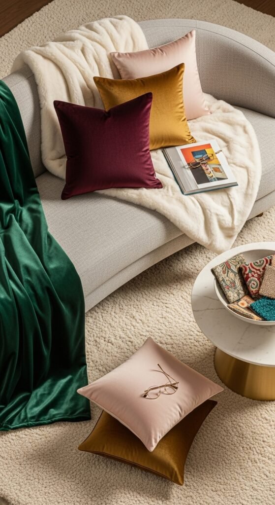 Bring in softness with velvet throws, faux fur blankets, and silk cushions. Mixing textures not only adds comfort but also makes your space look intentional and indulgent. The tactile quality invites relaxation and intimacy.