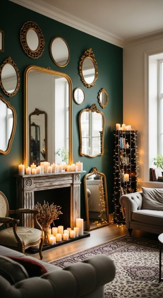 Mirrors bounce light around the room and make it feel bigger and brighter. A vintage gold-framed mirror or even a set of smaller decorative mirrors can add elegance and charm.