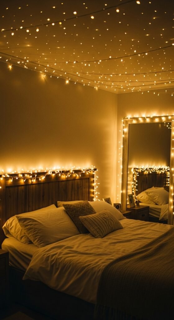 Fairy lights are a classic way to bring instant romance into any room. Their soft, twinkling glow adds warmth and creates a dreamy effect. You can: