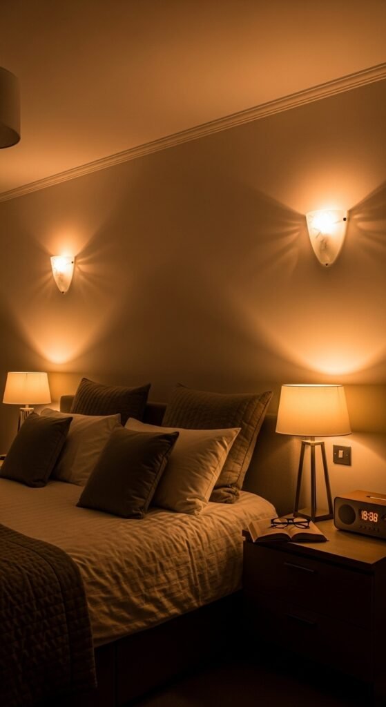 Harsh ceiling lights kill the vibe. Switch to ambient lighting with bedside lamps, wall sconces, or dimmable bulbs.