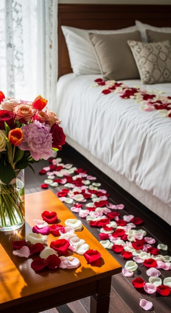 For special occasions, sprinkle rose petals on the bed or across the floor. It’s a small detail that creates a big impact.