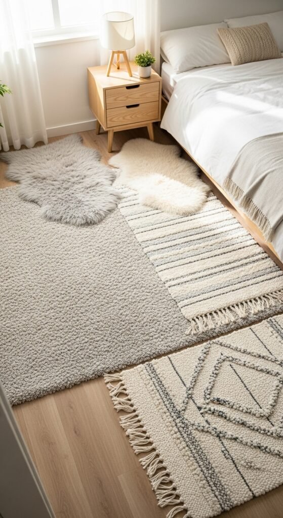 A soft rug instantly makes your bedroom warmer and more inviting. Go for shaggy rugs, faux fur, or handwoven styles in light neutral tones.