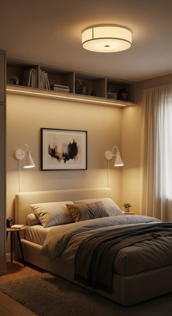Good lighting makes all the difference in a small bedroom. Use wall sconces instead of bedside lamps to save surface space, or opt for ceiling-mounted fixtures. Layering light sources ensures the room feels warm and welcoming.