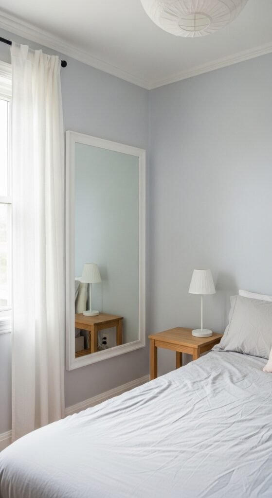 Light colors like white, beige, soft gray, and pastel tones make a small bedroom feel bigger and airier. Pair these shades with natural light for an even more spacious effect.