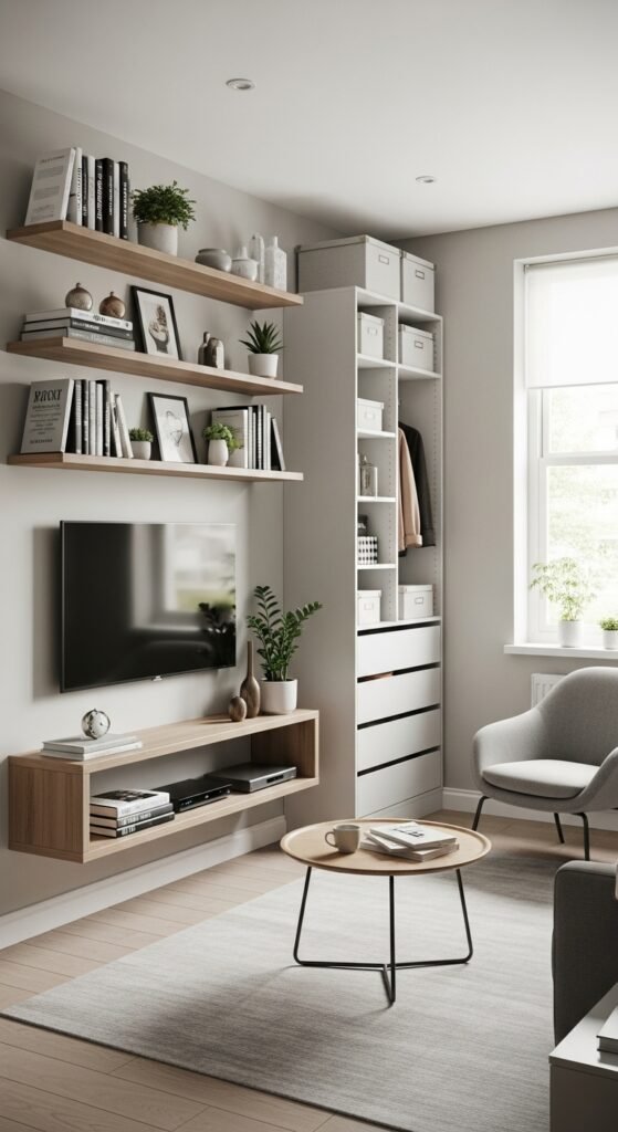 When floor space is limited, think upward. Install floating shelves, wall-mounted racks, or even a tall wardrobe to utilize vertical space. This not only keeps the room organized but also makes the area feel more open.