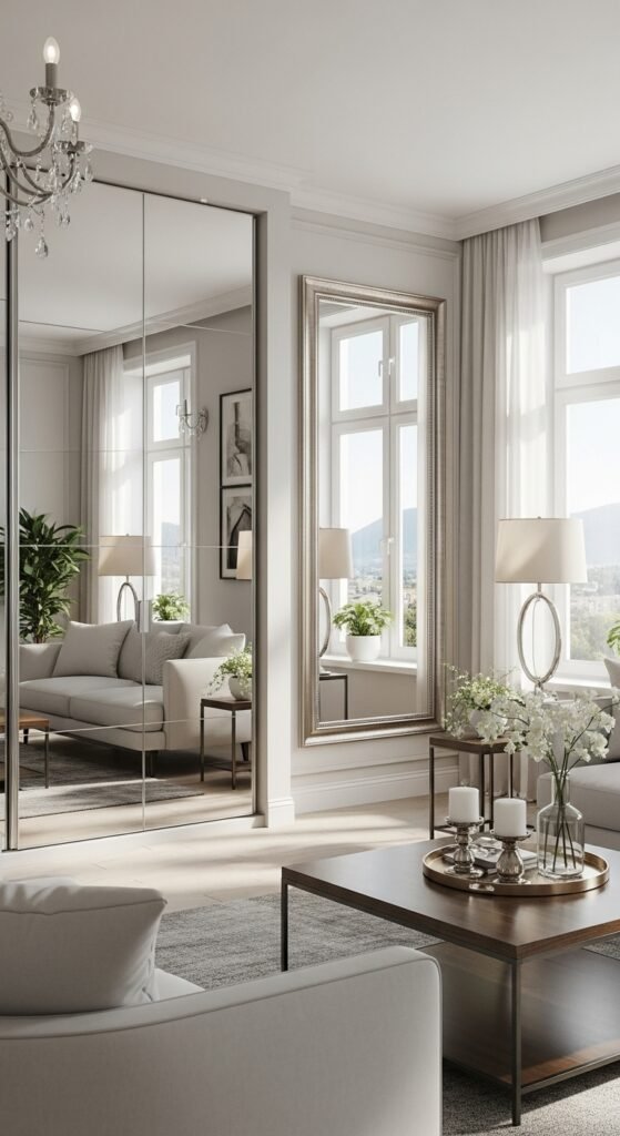 Mirrors are one of the oldest tricks in the book when it comes to making a room feel bigger. Place a large wall mirror opposite a window to bounce light across the room. Mirrored closet doors are another excellent space-saving solution.