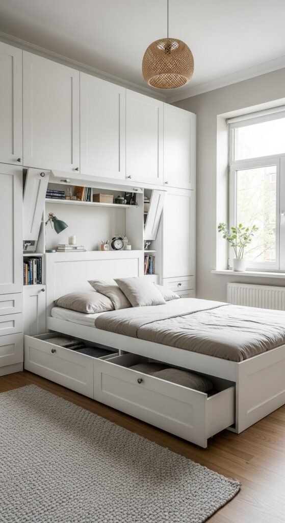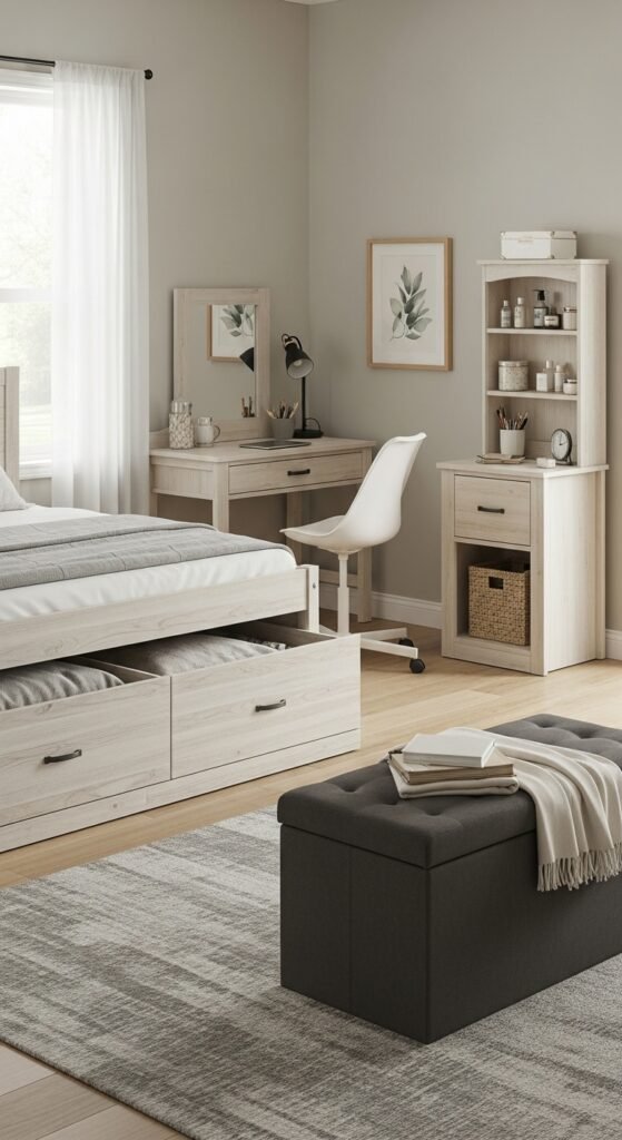 In a small bedroom, every piece of furniture should serve more than one purpose. Consider a storage bed with drawers, a desk that doubles as a vanity, or a nightstand with shelves. This helps you save space while keeping essentials within reach.